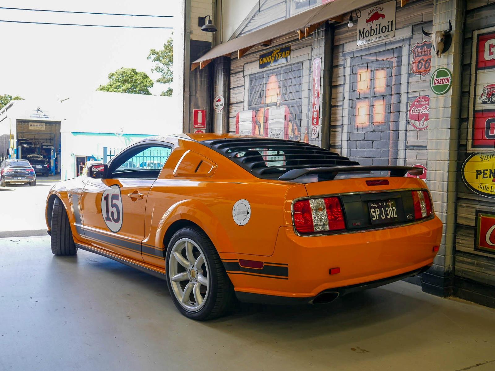 - The nostalgic touches, applied in Irvine, consist of black side and hood stripes, the latter framing a functional "shaker" hood; a black decklid, rear spoiler, and louvered rear window cover; and 19-inch Minilite-inspired alloy wheels. Of course, all the powertrain and chassis goodies are there, too, including a 3.73:1 rearend, a Tremec five-speed manual, specially calibrated Saleen N2 dampers and linear-rate coil springs, a Watts Linkage on the live rear axle, 14-inch slotted front brake discs with four-piston calipers, and the requisite 302-cubic-inch, 24-valve Ford modular V-8 replete with forged-aluminum pistons and forged-steel connecting rods and crankshaft.