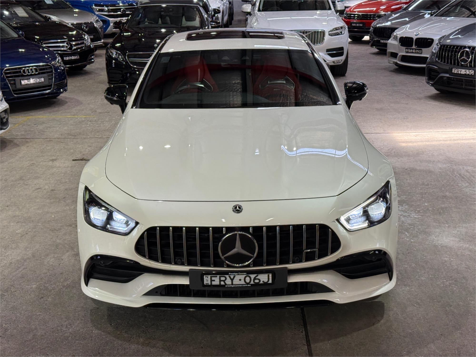 2019 Mercedes AMG GT 53 S finished in white with contrasting exclusive Brazil red sports leather trim, black accents and carbon fibre interior package.